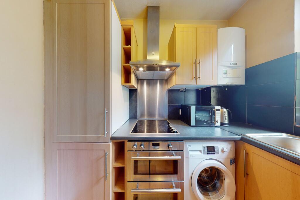 The quaint and functional kitchen features an electric hob, ample storage space, and stylish countertops.