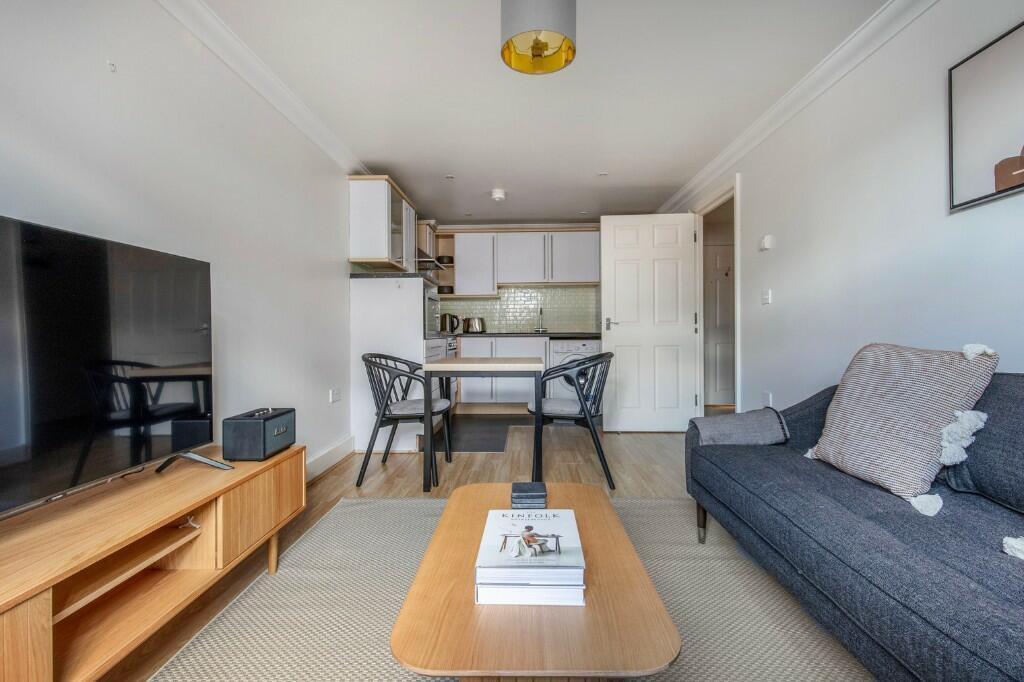 The accommodation comprises an entrance hall leading into a bright open-plan reception room with a fully integrated kitchen, a spacious double bedroom, and a modern bathroom fitted with both a bath and shower attachment. The apartment offers comfortable, low-maintenance living in a sought-after and highly convenient location.