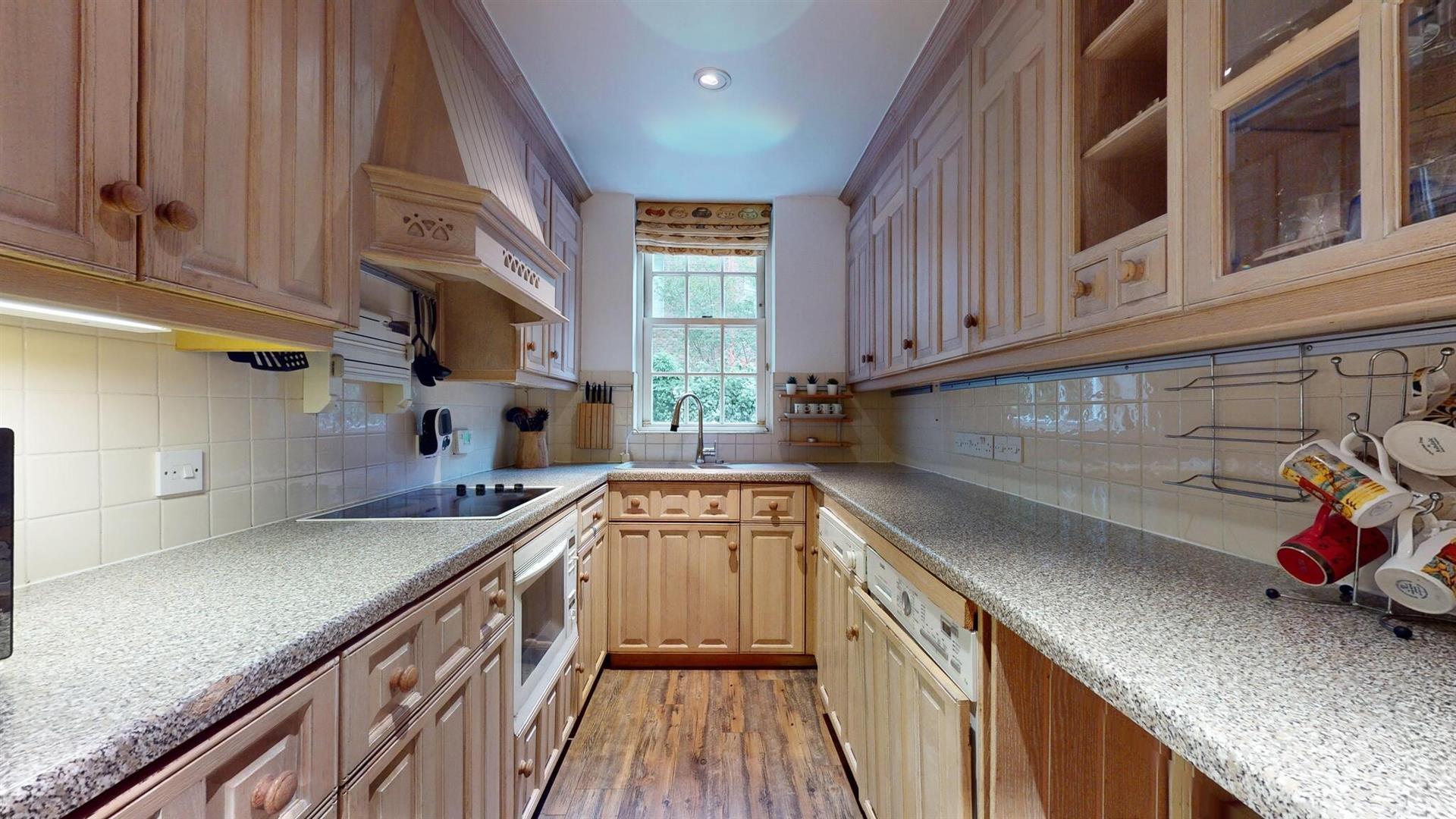 The generously sized reception room offers distinct areas for both living and dining, and opens into a well-appointed kitchen, fitted with a range of wall and base units for ample storage.