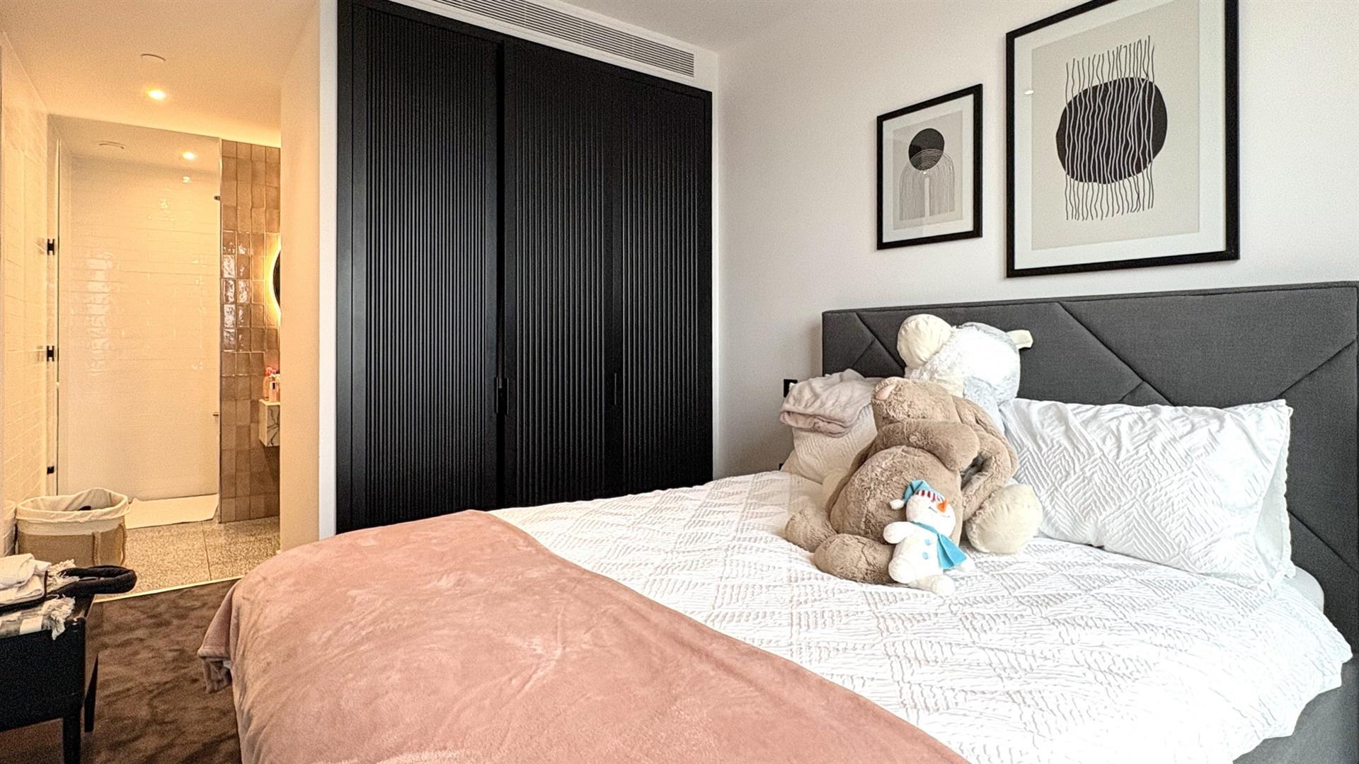 The apartment offers contemporary living at its finest, featuring a spacious open-plan kitchen and reception room with elegant wooden flooring, air conditioning, and access to a private balcony. Both bedrooms are generously proportioned, with the principal suite benefiting from a walk-through wardrobe and a stylish en suite, alongside a separate modern bathroom.